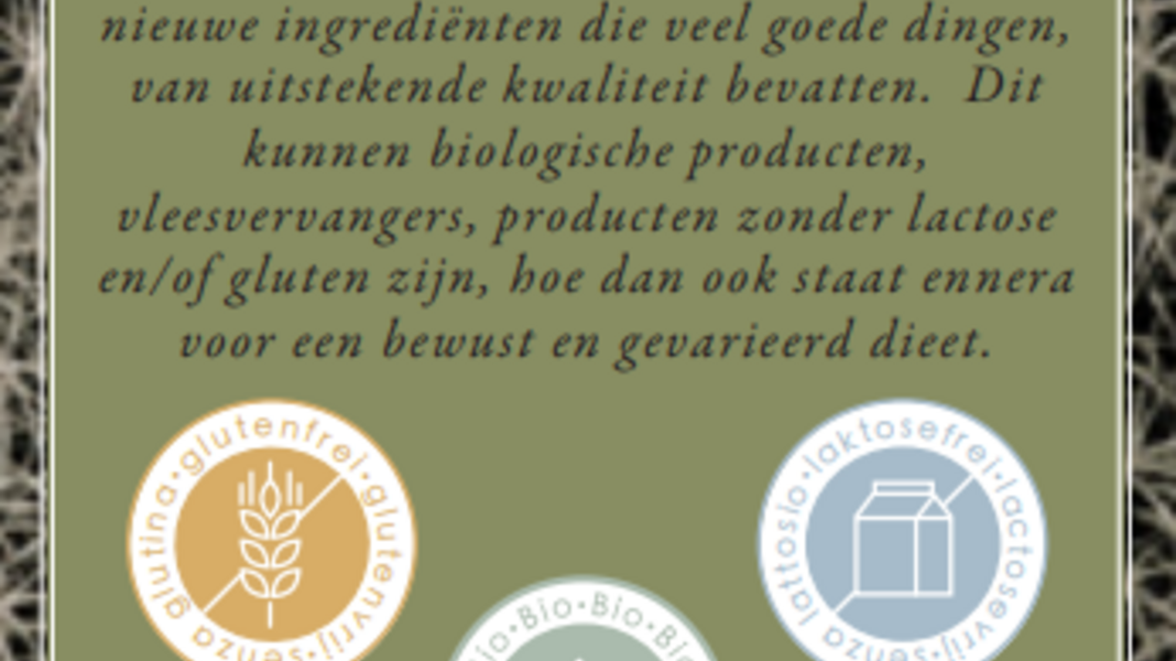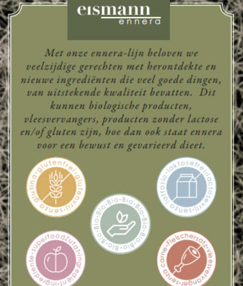 Met onze ennera-lijn beloven we veelzijdige gerechten met herontdekte en nieuwe ingrediënten die veel goede dingen, van uitstekende kwaliteit bevatten. Dit kunnen biologische producten, vleesvervangers, producten zonder lactose en/of gluten zijn, hoe dan ook staat ennera voor een bewust en gevarieerd dieet.