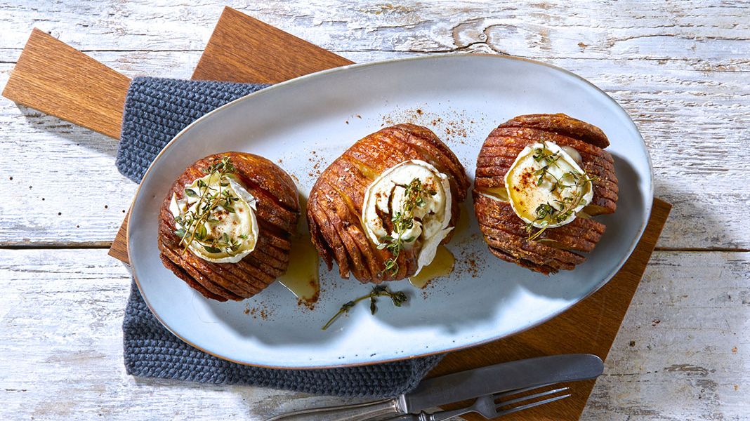 Plaats de aardappels met de ingesneden kant naar boven op een ovenplaat met bakpapier of ovenschaal en zet in een voorverwarmde oven op 180 °C gedurende ongeveer een half uur. Snijd ondertussen de geitenkaas in plakken en was de tijm.