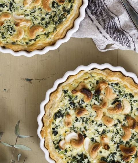 Haal de quichevorm uit de oven, schep het boerenkoolmengsel er in en verdeel de rest van de geitenkaas over de quiche. Garneer het met de cashewnoten en bak vervolgens nog 20 minuten in de oven.