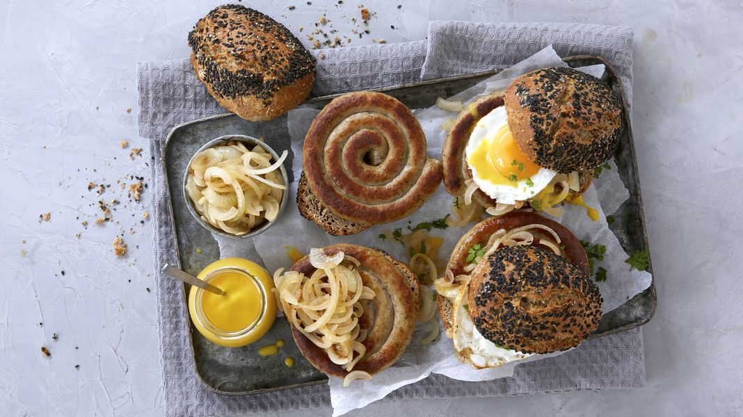 Snijd de broodjes open en bedek de onderste helft met de braadworstsnack, leg vervolgens de uien er boven op. Leg op de uien het gebakken ei en maak het geheel af met wat honing-mosterdsaus!