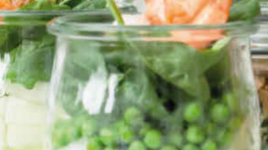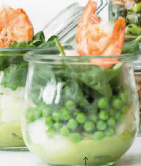 Maak de glazen op in laagjes: eerst de avocadodip, de stukjes meloen of ananas, de erwten en de spinazie en maak af met de gebakken garnalen.
