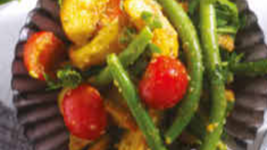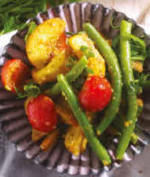Meng de pesto, olie en azijn door elkaar voor een dressing en meng het met de bonen, lauwwarme aardappelen en tomaten en breng op smaak met zout en peper.
