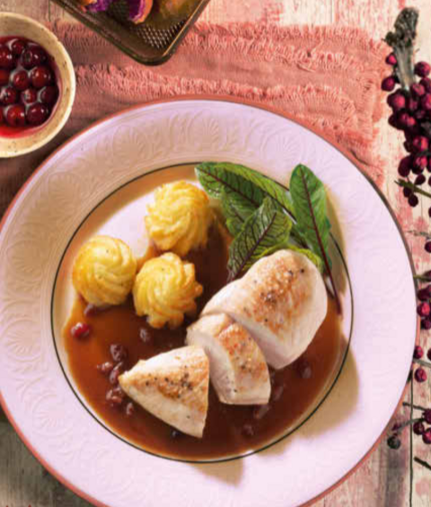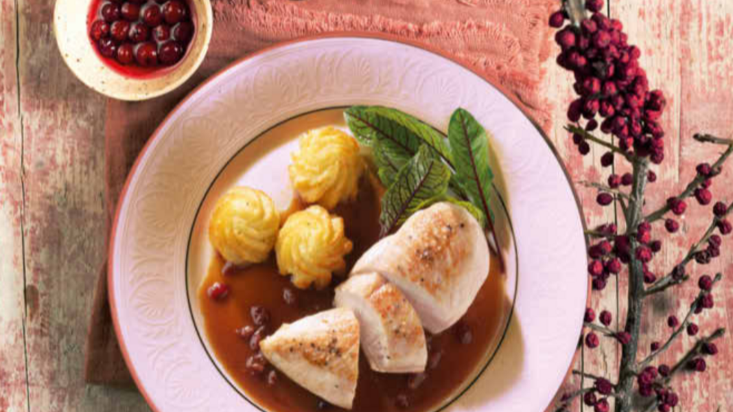 Bereiding Recept: Kippenborstfilet met cranberrysaus en pommes duchesse