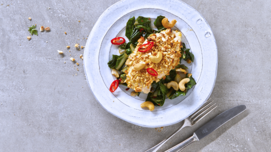 Klop het ei en haal de kipfilet hierdoor heen. Plaats aan een kant de cashewnoten en druk stevig aan. Leg de kipfilet op de bakplaat met de noten naar boven en bak het ongeveer 12-15 minuten.
