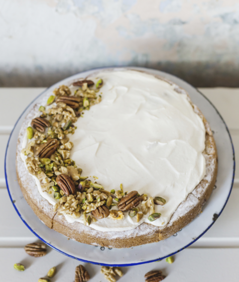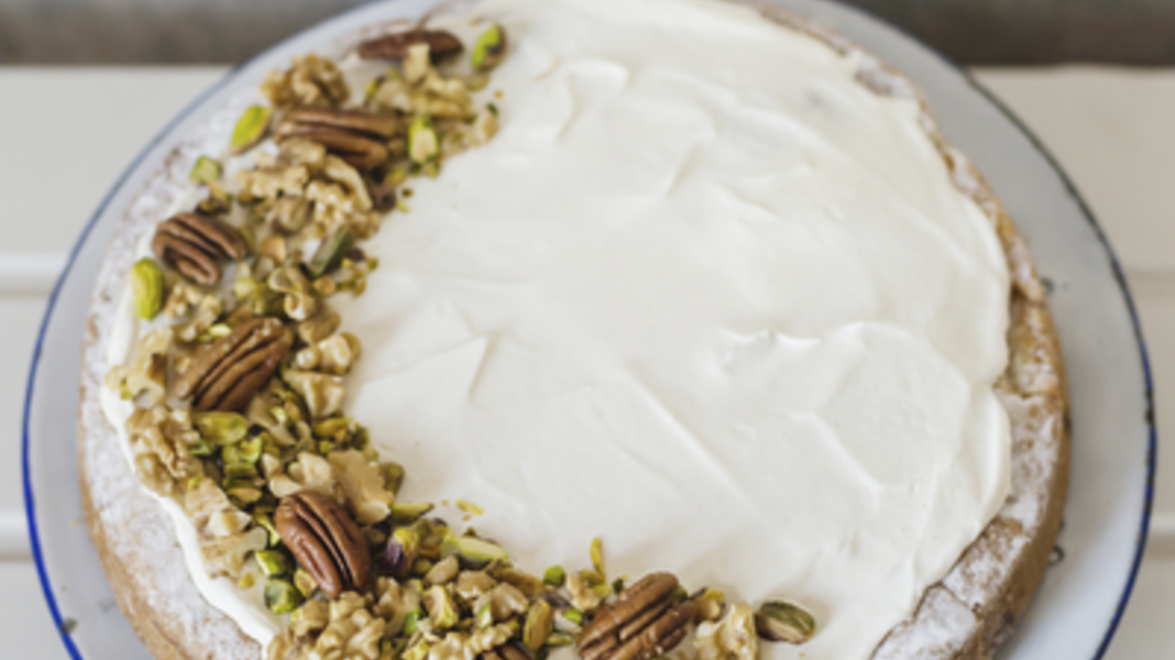 Hak de noten en strooi ze over de taart