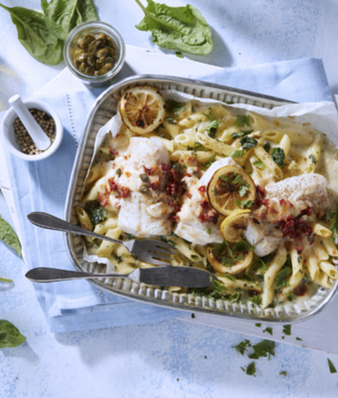 Bak het geheel in een voorverwarmde oven gedurende 25-35 minuten op 180 °C. Serveer de kabeljauwfilets samen met de penne en eet smakelijk!