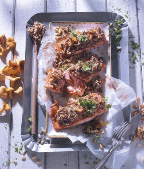 Wilde zalmfilet met een korst van cantharellen.