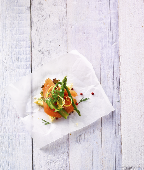 Leg een schijfje appel in het midden van het bord. Smeer er mierikswortelcrème op. Verdeel er wat rucolablaadjes, rode biet en de zalmplakken over. Herhaal dit een paar keer om een torentje te krijgen.