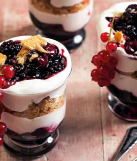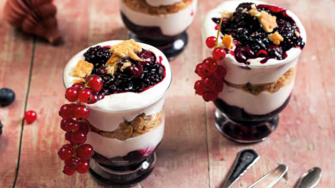Maak het dessert op door een glas te vullen met afwisselend het speculaasijs, de bessensaus, verkruimelde stukjes speculaas en het mascarponemengsel. Eindig met de bessensaus en versier met stukjes speculaas.