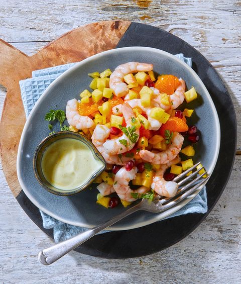 Ontdooi de garnalen volgens de instructies op de verpakking. Verwijder het staartsegment, spoel ze af met koud water en laat daarna goed uitlekken. Schil mandarijnen en snijd in partjes. Schil de ananas en snijd in kleine stukjes.