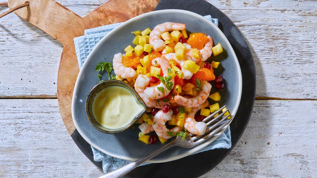 Meng voor de dressing yoghurt, granaatappelsap, kurkuma en limoensap door elkaar. Breng op smaak met zout en peper. Verdeel de salade in porties en verdeel de mandarijn, ananas, granaatappelpitjes en garnalen erover. Besprenkel met de dressing en serveer.