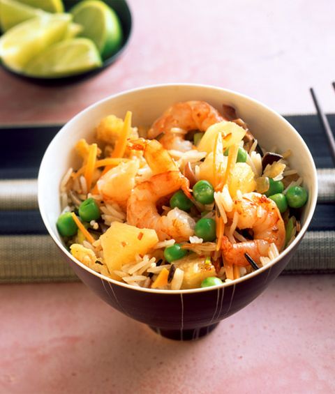 Verhit de olie in een pan of wok en bak de ananas goudbruin. Voeg daarna de garnalen toe en bak ze kort aan.