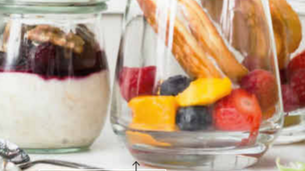 Maak van de ontdooide mangoblokjes, de vruchtenmix, een beetje honing en citroensap een fruitsalade en vul vier glazen hiermee halfvol.