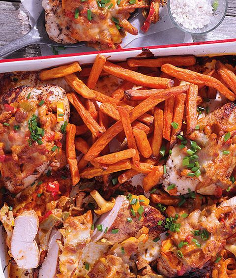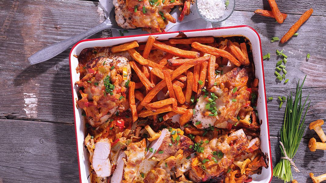 Leg de kalkoensteak in een ovenschaal en verdeel hierover de groenten in saus. Bestrooi met geraspte kaas. Verdeel de zoete aardappelfriet over een bakplaat met bakpapier. Zet de bakplaat en de ovenschaal in de oven en laat het staan gedurende 18-20 minuten.