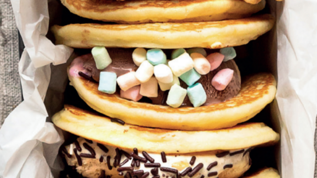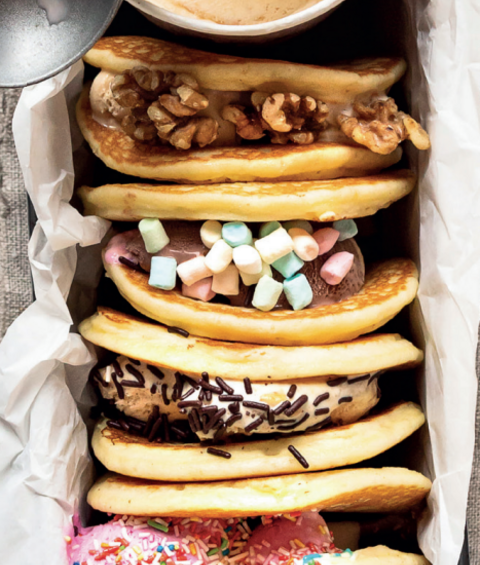 Vouw de Pancakes dubbel zoals een sandwich en bestrooi ze met de decoratie!
