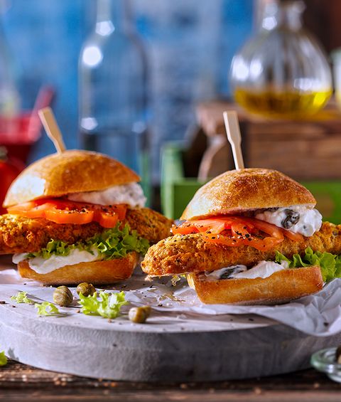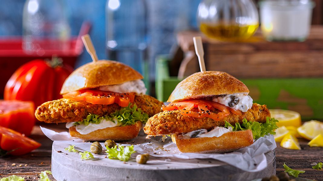 Een heerlijke burger, maar dan anders. De krokante visfilet met verse salade tussen twee broodjes krijgt een typische Italiaanse smaak door de room met kappertjes.