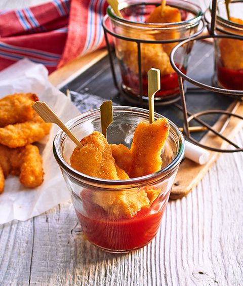 Doe in een glas een laagje ketchup of salsasaus en plaats de kippenspiesjes hierin en serveer.