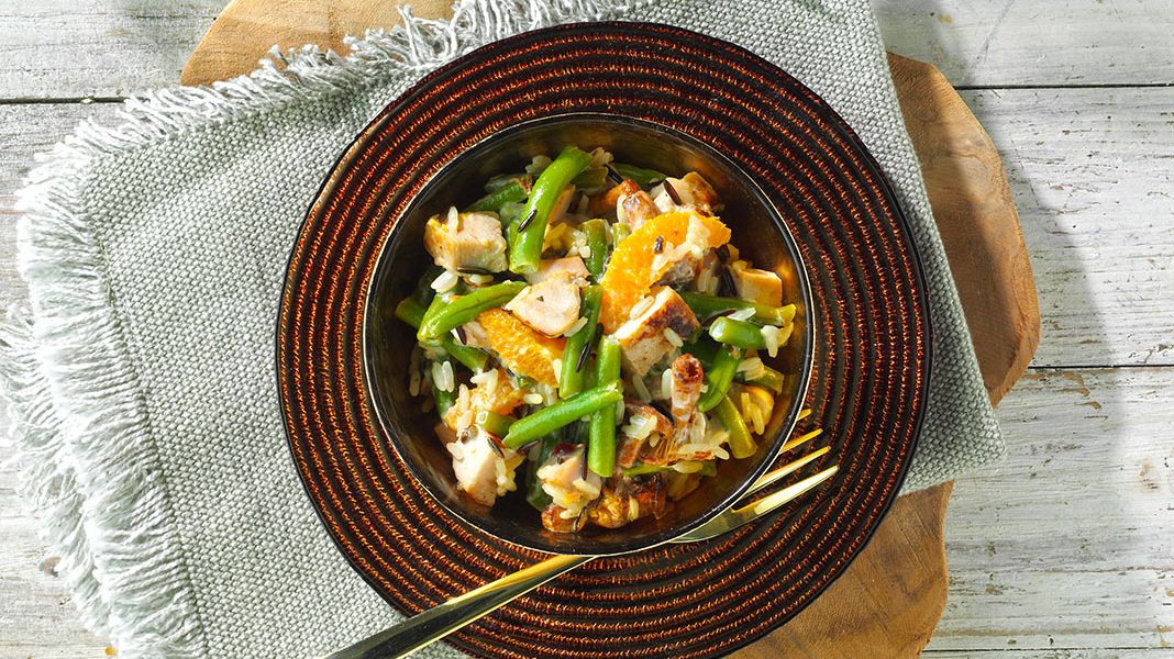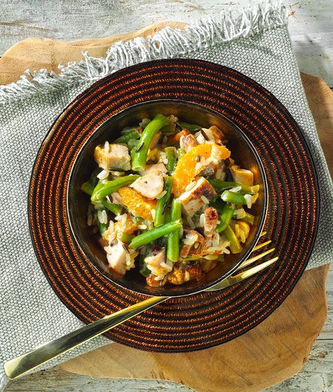 Snijd de kip in kleine blokjes en meng met de rijst, bonen, cantharellen, sinaasappels (een paar partjes apart houden voor garnering) en meng de dressing er voorzichtig door. Leg op borden en serveer met partjes sinaasappel en kruiden.