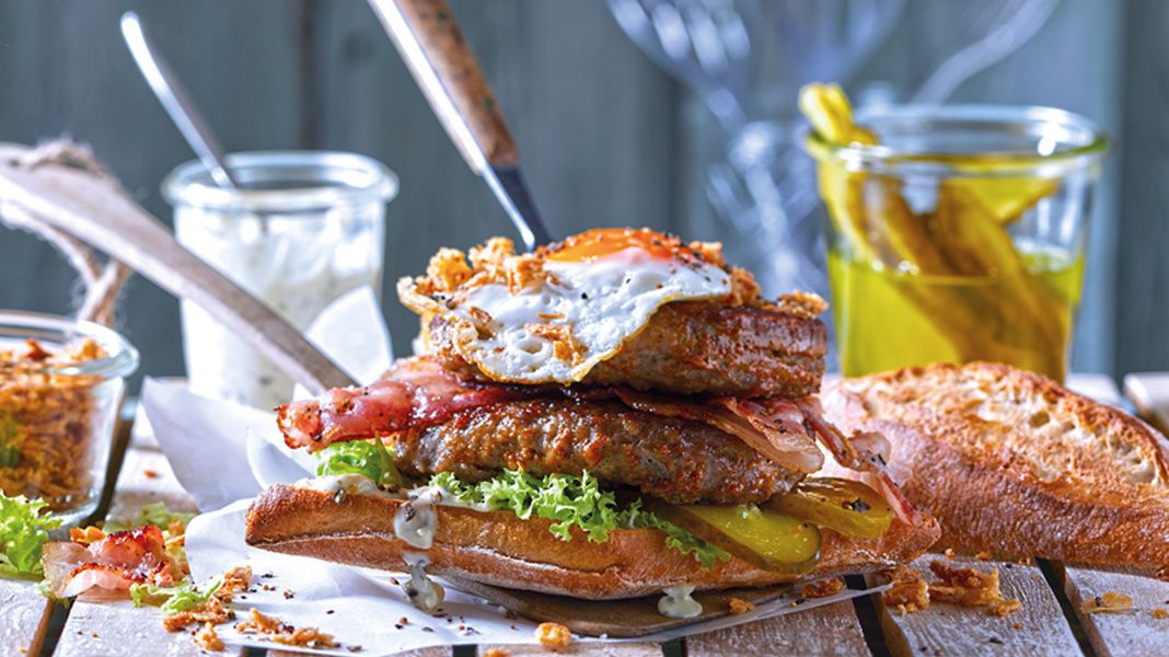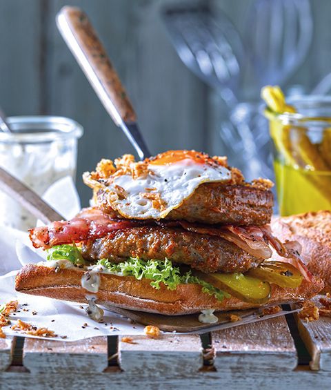 De klassieke hamburger, maar dan anders... Met twee sappige Runderhamburgers, knapperige bacon en verfijnd met een gebakken eitje. Zo'n hoge hamburger schept hoge verwachtingen!