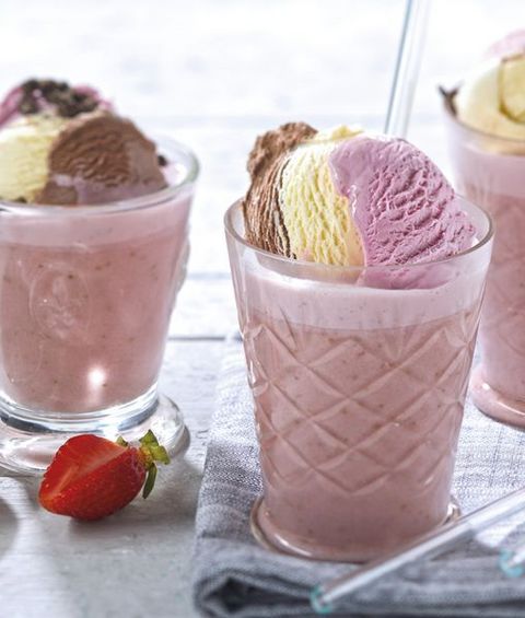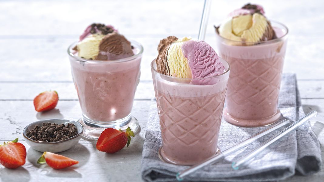Deze milkshake heeft drie onmisbare ijssmaken in een! Aardbei-, chocola- en vanille-ijs! Lekker en verkoelend.