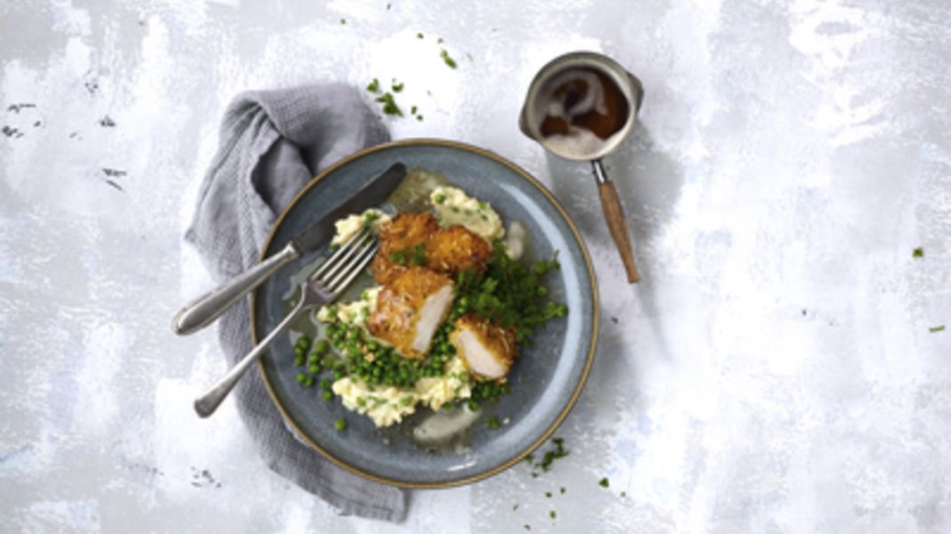 Een harmonieus contrast tussen de zachte en romige aardappelpuree, de knapperige doperwten en de smaakvolle mini-kipschnitzels.