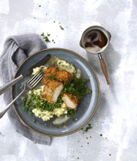 Schik de aardappelpuree en doperwtjes op de borden, leg de mini-kipschnitzels erop en garneer eventueel met verse kruiden