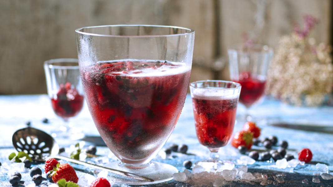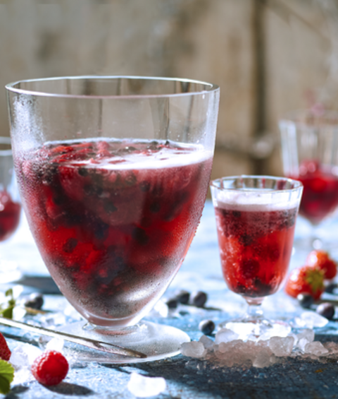 Vlak voor het serveren doet u de siroop, de resterende wijn en de resterende vruchten erbij. Roer alles voorzichtig door. Voeg mousserende wijn of mineraalwater toe en serveer direct.