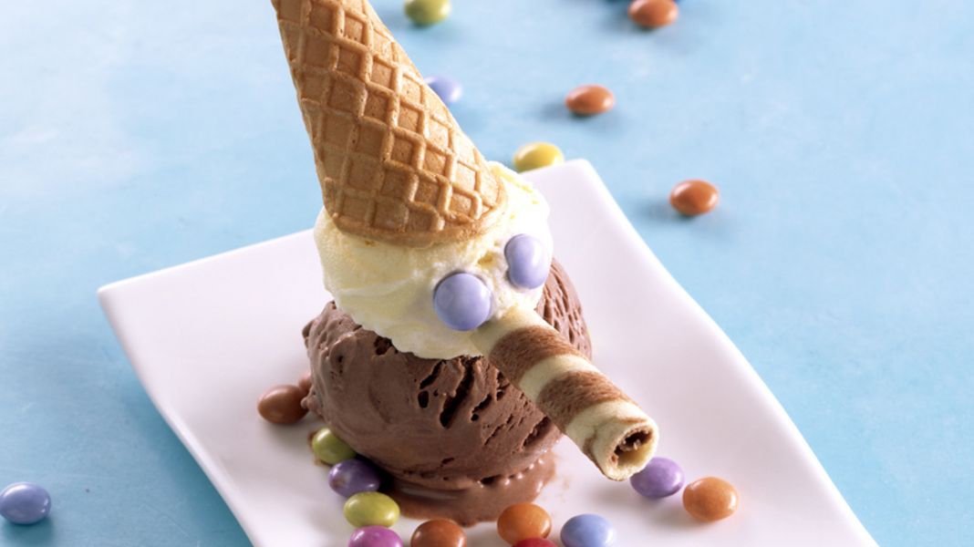 Leuke én lekkere ijscreatie voor kinderen (en volwassenen) met chocolade- en vanille-ijs.