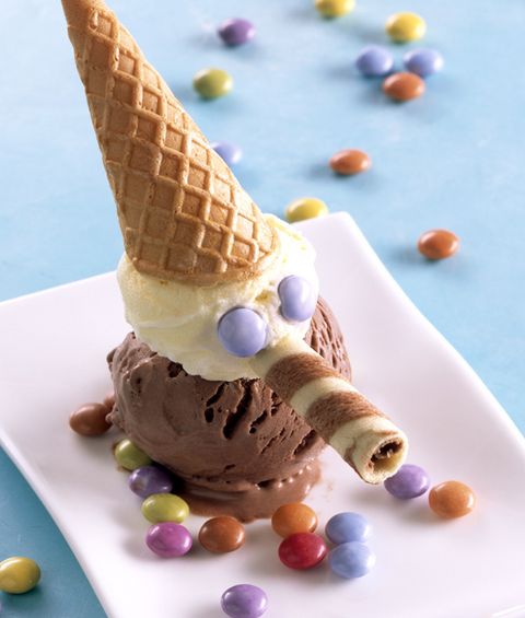 Zet het ijshoorntje bovenop het ijs als hoedje.