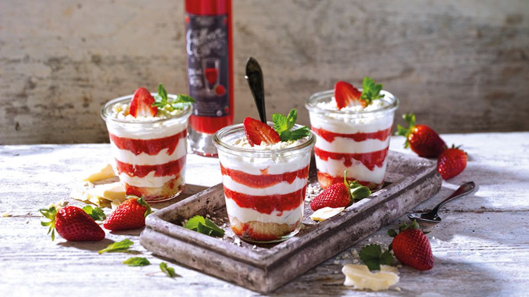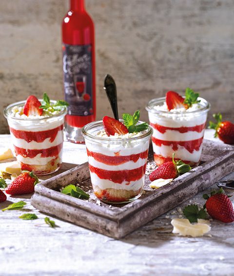 Geen dessertglaasjes? Kan ook in een mooie schaal worden gemaakt en daarna op een mooi bord worden geschept. Serveer met wat schijfjes aardbei ernaast.
