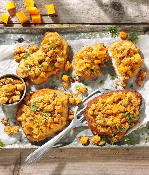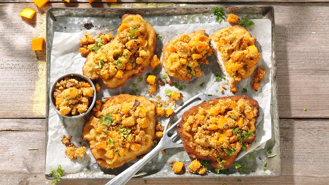 Verdeel het pompoenmengsel over de schnitzels en druk het iets in. Bak in de oven op 200 °C gedurende een kwartier.