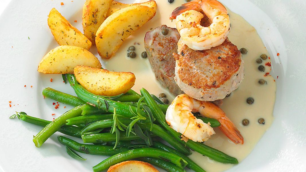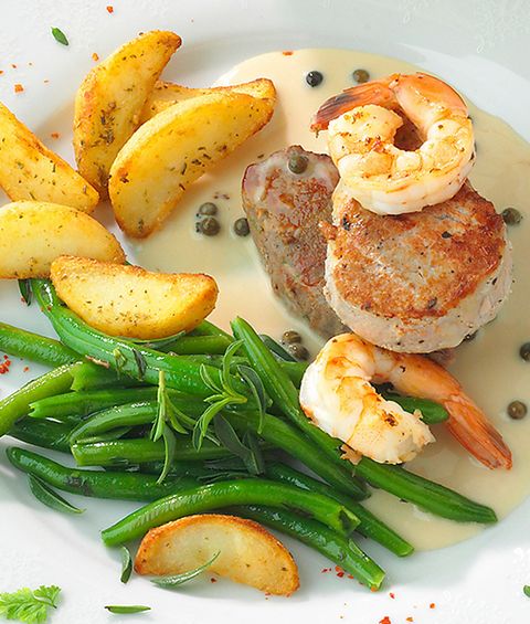 Plaats het vlees met de saus op een groot dinerbord en leg de garnalen erop of ernaast. Serveer met de rozemarijnaardappels en de boontjes.