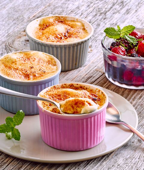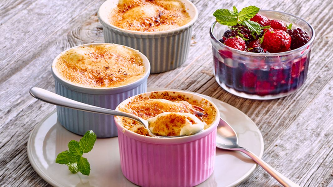 Heeft u wel eens een crème brûlée gemaakt? Het is vaak veel werk en lastig te maken. Probeer eens ons verleidelijk eenvoudige recept met romig vanille-ijs in plaats van room. Gekarameliseerd en afgemaakt met een frisse fruitcompote.