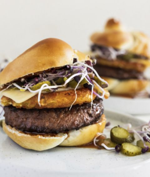 Smeer beide helften van de broodjes in met de saus. Leg de vega burger op de onderste helft, gevolgd door de röstischijf en kaas. Garneer het geheel met de augurkenplakjes en leg het kapje op de burger. Eet smakelijk!