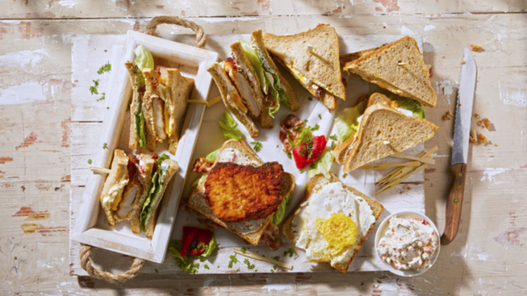 Bak de eieren in een pan met een beetje boter. Bereid daarna de sandwiches als volgt: toast met kruidenkaas, sla, bacon, toast met roomkaas met paprika, kipschnitzel, gebakken ei en bedek met een toast met roomkaas.
