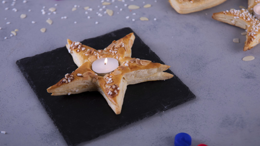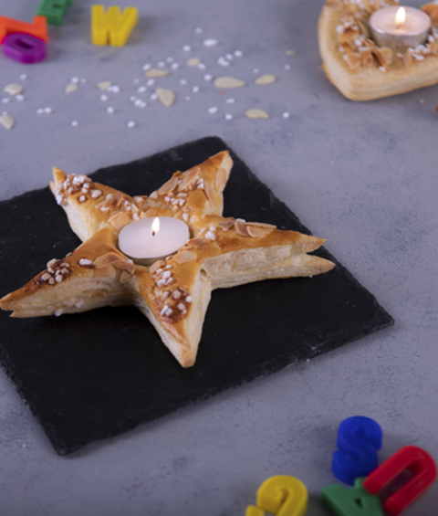 Bak het bladerdeeg ongeveer 20-25 minuten goudbruin. Maak van het resterende deeg kleine sterren of andere vormen en bestrijk ook deze met ei en bestrooi met suikerparels en amandelschaafsel. Bak deze ook goudbruin in de oven.